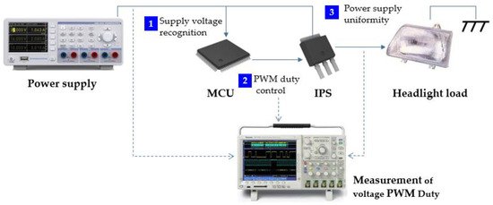 As explained in the previous section, when the headlights are turned on, a non-uniform drop in voltage occurs from the SJB to each headlight due to the different lengths of the connecting wire. Therefore, the power supplied by the SJB needs to be stable despite variations in the length of the wire. In addition, the capacity in the SJB needs to be sufficient to satisfy the demands of each headlight in terms of the inrush current. As this is a factor that may reduce the life of the headlight, there is also a need to tailor the driving method to prevent the headlight from experiencing premature burnout. In the proposed SJB, this was accomplished via PWM control. A schematic of the test setup used to evaluate the uniformity of the power delivered by the SJB is shown in Figure 15.