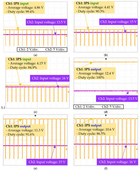 Measured input voltage and IPS duty cycle (PWM waveform): (a) IPS input duty cycle at 13.5 V; (b) IPS input duty cycle at 15 V; (c) IPS input duty cycle at 16 V; (d) IPS output duty cycle at 13.5 V; (e) IPS output duty cycle at 15 V; and (f) IPS output duty cycle at 16 V.