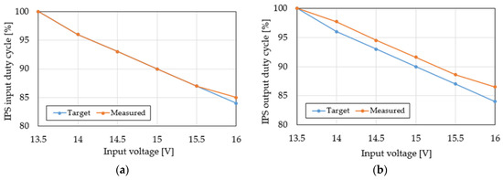 The input and output duty cycles of the IPS for various input voltages are shown in Figure 17. As shown in the figures, as the input voltage increased, the error between the target and measured duty cycles tended to increase. In particular, the input duty and output duty cycles of the IPS were 84% for an input voltage of 16 V. Although the error between the target and measured duty cycles was 2.5%, the rms value of the IPS output voltage was 13.44 V, which satisfies the desired target (13.5 V) and does not degrade the life of the headlight.