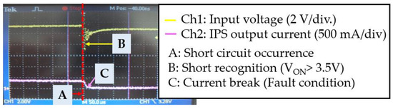 The results of the tests that were conducted to assess the overload and short circuit protection capability of the SJB are provided in Table 5. A test was deemed to have been passed when the output current of the IPS dropped to 0 in the event of an open or short circuit, yet the IPS continued to operate normally. In contrast, a test was deemed to have been failed when the output current of the IPS was non-zero or the IPS itself failed to operate correctly. As shown, the SJB passed all tests.