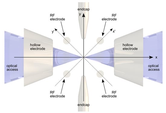 - Herskind, P.F.; Dantan, A.; Albert, M.; Marler, J.P.; Drewsen, M. Positioning of the rf potential minimum line of a linear Paul trap with micrometer precision. J. Phys. B At. Mol. Phys. 2009, 42, 154008. [Google Scholar] [CrossRef]