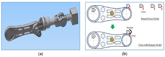The 2nd robot arm, together with the subsequent arms and distal-end joint, is shown in Figure 3a. All the subsequent arms are treated as point masses (also known as remote forces) which are used to transfer the force at the distal-end joint (right side) to the 2nd robot arm. Consequently, a resultant force FY and two resultant moments MX and MZ are applied to the 2nd robot arm as shown in Figure 3b.