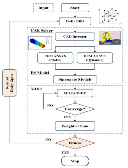 With the advance of digital twins in smart factories, the use of simulation technologies to address computation-expensive and multi-objective optimization issues has become an important research topic. Design optimization is the process of establishing the right combination of product parameters that satisfy project requirements [1]. Structural optimization can be separated into three main categories: size, shape, and topology optimization [2]. In a structural design process, a topology optimization is first performed to obtain an initial sketch of the optimal configuration of the structure; the suggested configuration is interpreted to draw an engineering design, and this design is then optimized using detailed sizing and shape optimization methods together with realistic design constraints. These methods are not only able to optimize the robot arm but can also be extended to the design of the whole robot system. For the purpose of improving the performance of industrial robots, a number of research works have been carried out with respect to the related topics in recent years. Some works focused on the selection criteria of the servo motor and gearbox for optimizing the servo drive system [3,4]. A few reports studied new control algorithms to obtain high speed performance, such as residual vibration suppression [5]. Certain researchers used the finite element method (FEM) to optimize robot structure. Roy et al. used the finite element method to design a high-performance robot arm and reported experimental structural data to support the design of the robot arm [6]. Park and Asada studied the design optimization of the mechanical structure and control of a two-link robot for which the weight and inertia of the robot arm were minimized to attain high-speed positioning [7]. Sahu and Choudhury used the FEM of the ANSYS workbench to optimize the performance of a six-axis industrial robot via stress, modal, and dynamic behavior analyses [8,9,10]. Pupăză et al. also used an FEM-based optimization technique to study the influence of the static and dynamic behaviors on the positioning accuracy of robots [11]. Chen et al. analyzed the static strength and stiffness of a two-link robot and then used a topology optimization method to design the structure for quality improvement [12]. In the above studies, it was revealed that CAE together with FEM-based design optimization can be an important tool for attaining structural performance improvement in real-world engineering applications. However, for cases with large design space or the requirement of attaining numerous design samples, the high computational effort of analysis may hinder the implementation of the conventional FEM-based design optimization methods in the design optimization process. On the other hand, only a few researchers have studied the multi-objective and computational inefficiency problems related to the design optimization of industrial robots.