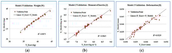 In statistical analysis, the coefficient determination of R2 [30] is a measure used to assess how well a model can explain and predict outcomes. It is also commonly known as “R-squared”, to be used as a guideline for measuring the accuracy of the model. It ranges from 0 to 1 and will be closer to 1 when the model is more precise. Joglekar and May [31] suggested that the value of R2 for the best-fitting model should be at least 0.8. According to each DOE matrix, the obtained model is able to produce a predicted response (called Y_Model). The analyzed response produced by the CAE solver is called Y Exact. If these two values are equal, the red points in Figure 7 will lie on the diagonal line. The R2 values of W, J, and D models being, respectively, 0.9875, 0.9865, and 0.9229 mean that the surrogate models evaluated in this study can be used to explain the W, J, and D very well.