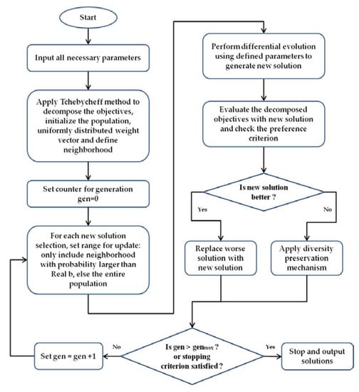 We also set the preference criteria shown in Equation (5) as w1 = 0.4, w2 = 0.35, w3 = 0.25 and in Equations (15) and (16) as ε1 = ε2 = 5%. A flowchart of the MOEA/D-DE algorithm for multi-objective optimization is shown in Figure 8.