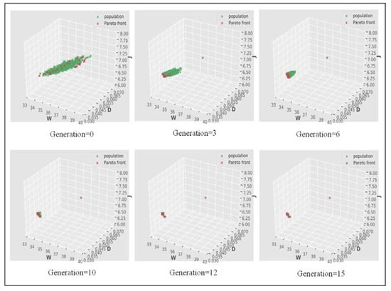 In solving a multi-objective optimization problem, a solution that has one or several objective functions that are impossible to further optimize while other objective functions are not deteriorating is called “Pareto optimal” [32]. In this case, the Pareto front history of MOEA is plotted in Figure 9, and it is obvious that the solution started to converge at the 10th generation of MOEA.