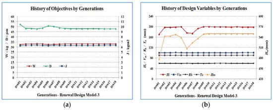 The multi-objective optimization problem of Equation (5) was evaluated to obtain the weighted sum result. The objectives and design variables in different models and generations according to the preference criteria on the optimal candidate in each generation of MOEA are shown in Figure 10a and Figure 10b. Optimal values for W of 33.02 kg, J of 6.3328 kg.m2, and D of 0.0491 mm were obtained for Hi = 198.81 mm, Hm = 549.99 mm, Vm = 100.07 mm, Rh = 60.00 mm, and Ta = 90.13 mm.