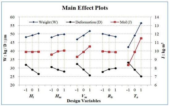 A main effect is frequently used in the context of factorial designs and regression models to distinguish main effects from interaction effects. A main effect occurs when the mean response changes across the levels of a factor. According to the ranges of design variables in Table 1, the lower bound is denoted as level (−1), the upper bound is denoted as level (+1), and the average of the two is denoted as level (0) when running the DOE. The main effect plots for the objectives of weight (W), deformation (D), and moment of inertia (J) are shown in Figure 11. Several results observed in the main effect plots are stated below.