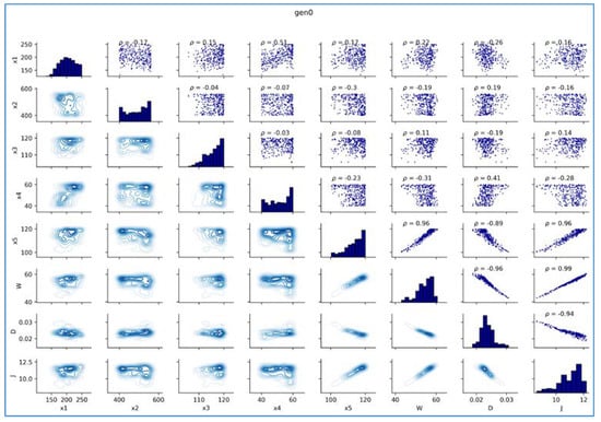A pairwise plot of the relations between the objectives and design variables was obtained and is shown in Figure 12. At the first generation, we can see that our evolutionary algorithm takes random samples for each variable from x1 to x5 within the defined lower and upper bounds. Using Kernel Density Estimation (KDE), we can visualize the distribution for each parameter with respect to other variables and confirm that the sampling was indeed randomly distributed. Histogram plots also confirm that the initial population was distributed throughout the parameter space (lower and upper bounds of each variable). Interestingly, the scatter plots and correlation coefficients reveal that the proposed mathematical model can be attained in the parameter space of variables. Only variable x5 is linearly correlated with the objectives W, D, and J. Also, W, D, and J are linearly correlated with each other. In detail, W has a negative correlation with D, and D has a negative correlation with J. However, W and J have a positive correlation. So, we can conclude that for smaller values of W and J, we can expect to have a larger value of D. Similarly, for a smaller value of D, we expect to have larger values of W and J. From a mechanics point of view, this can be seen as (1) W being directly proportional to J, (2) W being inversely proportional to D, and (3) J being inversely proportional to D. Thus, we can conclude that our surrogate model captures the mathematical properties of the system nicely.