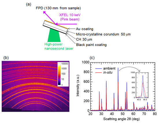 We performed X-ray diffraction measurements of a matter under shock-compression in the reflection geometry. The experimental setup is shown in Figure 4a. A multi-layered sample was irradiated by a high-power laser pulse with a pulse energy of 30 J in a 10-ns duration. The time delay between the laser and the XFEL pulses was 11 ns. The XFEL pulse was line-focused to be 30 µm (vertical) in FWHM by using one elliptical mirror of the KB optics. As shown in Figure 4b, owing to the wide observation range of the FPD, multiple diffraction lines from the corundum (Al2O3) were observed in a single-shot measurement. Figure 4c shows line profiles of the diffraction pattern of ambient and in-situ. The most intense peak at 45.5 degrees is the diffraction line of the Al2O3(116). The peak broadening to the large angle side is observed in the in-situ data that is consistent with the compression of the corundum due to the laser irradiation.