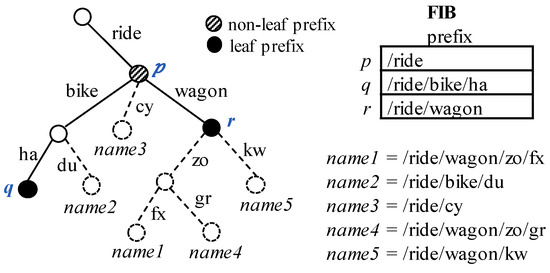 - Lee, J.; Lim, H. A new name prefix trie with path compression. In Proceedings of the 2012 IEEE International Conference on Consumer Electronics-Asia (ICCE-Asia), Seoul, Korea, 26–28 October 2016; pp. 1–4. [Google Scholar] [CrossRef]