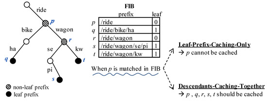 In a route caching scheme, the matching result from the FIB is cached to be looked up faster for subsequent reuse. If the matching result is one of the leaf prefixes in the FIB, that result can be safely cached without causing any coherency problem. However, in the case of non-leaf prefixes, it causes incomplete prefix caching as mentioned in Section 2.2. Such a problem occurs when a non-leaf prefix is cached, but not all of its descendant prefixes are cached. In Figure 3, suppose that prefix p is cached, but its descendant prefixes q, r, s, and t are not cached. Now, an interest packet arrives with a name, /ride/bike/ha/xo. Obviously, q is the longest matching prefix for the name; however, q was not cached and p is misleadingly matched with it in the cache. To avoid misleadingly caching, we could consider two simple approaches: any non-leaf prefix is not allowed to be cached, or all the descendant prefixes should be cached when a non-leaf prefix is cached. The benefit of the first idea is restrictive. As shown in Figure 3, the non-leaf prefixes p and r cannot be cached. Furthermore, in the second approach, when p is cached, its descendants q, r, s, and t should be cached together. This results in a huge burden to cache all the descendant prefixes, in the aspects of cache replacement and miss penalty. Thus, both approaches are considered not to be viable in practice.