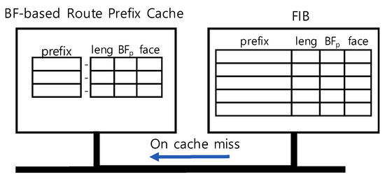 Routing for a packet delivery is performed according to the matching prefix in the FIB; thus, the prefix is also called a route prefix. A route prefix represents a common route for multiple names. Thus, the name lookup time can be greatly reduced if the route prefix is cached, which is called route prefix caching or prefix caching. A few prefix caching schemes were proposed to perform the name lookup efficiently [18,19].