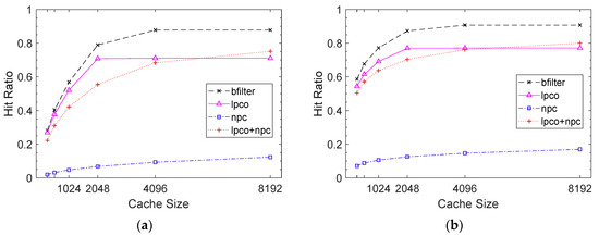 Non-leaf prefix caching without any supplementary method causes an incomplete prefix caching problem. A few caching schemes to avoid the problem are compared in Figure 9. Our Bloom filter-based scheme is denoted by “bfilter”, and the Leaf-Prefix-Caching-Only scheme, which allows only leaf prefixes to be cached, is denoted by “lpco”. The No-Prefix-Caching scheme, which caches a content name itself instead of its matching prefix, is denoted by “npc”. “lpco+npc” denotes a scheme which caches a matching leaf prefix or a content name in cases where the matching prefix is a non-leaf prefix. The Bloom filter-based prefix cache is far superior to the other schemes in the cache hit ratio. “npc” no doubt shows the worst cache hit ratio because it does not cache prefixes and, thus, it does not exploit any spatial locality. The cache hit ratio of “lpco+npc” is worse than that of “lpco” up to the cache size of 4096 entries. The content name caching requires more cache entries to utilize a similar level of the locality. Therefore, “lpco+npc” results in more conflict misses than “lpco” in a small cache. However, if the cache is sufficiently large, “lpco+npc” can utilize the space and reduce the cache misses, even in cases where the matching prefix is a non-leaf prefix.