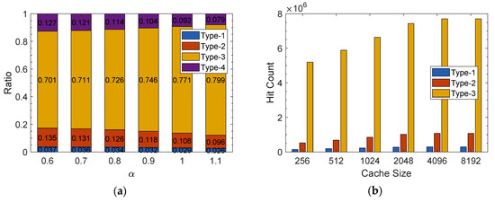 Observations with regard to the type of matching prefixes: (a) distribution of matching prefixes in the traces with α, from 0.6 to 1.1; (b) cache hit count on matching prefix types.