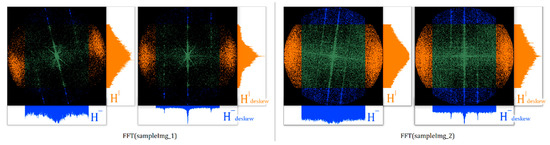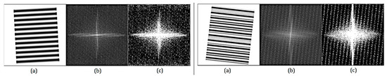 We define a confidence metric (Equation (1)), which depends on the detected dominant lines’ strength in an FFT image I. The absolute value of the difference between two parameters: the mean color of all pixels L within some fixed distance range from the dominant line, and the mean color of the rest of the image, I\L, the complement of L. We consider black to be zero and white to be one, so the confidence is also between zero and one. The obtained measure is fine-tuned by being raised to some positive exponent , since a balance between all algorithms’ confidences will be enforced by employing a power–law relation, and their corresponding will be chosen to ensure equal average success confidence (i.e., excluding confidence in failure cases).