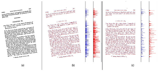 (a) Input: skewed document; (b) points of connected components’ axis-aligned bounding boxes (AABBs): top (blue) and bottom (red) sides and their associated scanline histograms; (c) same as ‘(b)’, but the histograms have maximum variance as the page is correctly oriented.