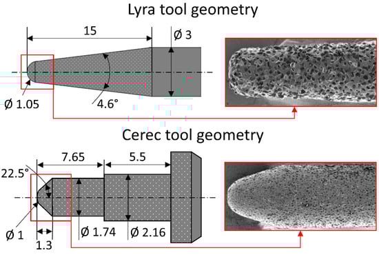 Geometry of the two tools used in the study (all lengths and diameters in mm).