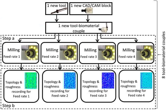 The influence of the feed rate on the surface roughness with the eight practicable couples is investigated at four different feed rates (1000-2000-3000-4800 mm/min). The feed rate is the relative displacement speed between the tool and the workpiece. Therefore, thirty-two experiments are necessary (Figure 3). These four feed rates are tested on the same biomaterial CAD/CAM raw block (one feed rate per side). A new tool is used for each new biomaterial raw block. For each experiment, a planar area (5 × 15 mm²) is milled on each side of the CAD/CAM block (Figure 3, Step A). The size of the planar machined surface is suitable with the raw dimensions of the CAD/CAM block and allows the topology and 3D roughness to be measured correctly, freeing it from unusable areas (CNC acceleration/deceleration areas). The axial (ap) and radial (ar) depths are 0.5 mm and 0.1 mm respectively. To sweep 5 × 15 mm² with a radial depth of 0.1 mm each tool moves back and forth fifty times. The total path length is 750 mm (=50 × 15 mm) per feed rate. The total milled volume (chip volume) per tool is 150 mm3 (=15 mm × 5 mm × 0.5 mm × 4). All the dimensions are reported in Figure 2.
