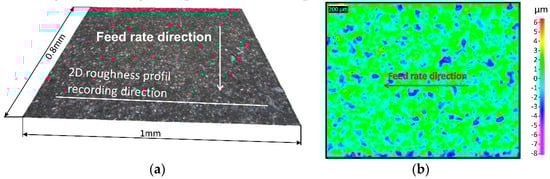 Each milled surface roughness is characterized according to the diagram presented in Figure 3 (Figure 3, Step B). Two dimensional (2D) and three dimensional (3D) roughnesses are computed according to ISO 4287, 4288 standards [25,26] for 2D roughness applications and ISO 25178 standards [28] for 3D applications. The 3D roughness parameters are computed on 0.8 × 1 mm2 planar surfaces. Two surfaces per sample are recorded and 3D roughness are computed in the middle of the milled surface. Then, the mean and standard deviation are calculated. In accordance with standard EN 623-4 [29], aberrant points are excluded from the area, if necessary. From each 3D surface recording, 2D roughness profiles are selected and extracted perpendicularly to the feed rate direction (Figure 4a). Three profiles (around 1 mm length) per sample are selected in the middle of the milled surface. Then, the mean and standard deviation are calculated.