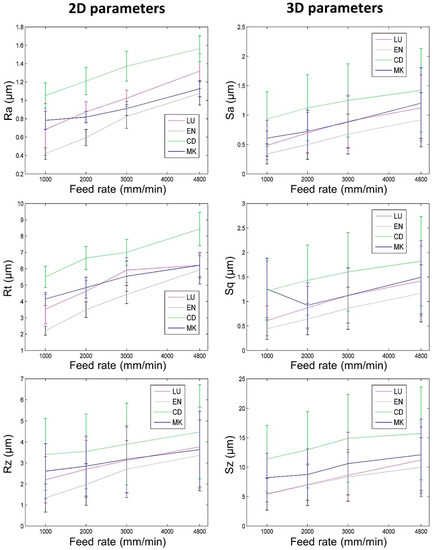 For the eight tool-biomaterial couples, it was observed that 2D and 3D surface roughness seemed to be weakly influenced by the feed rate (Figure 5 and Figure 6). Regarding Ra and Sa, a mean increase of respectively 0.46 µm and 0.48 µm was observed when the feed rate ranged from 1000 to 4800 mm/min. Regarding Rz and Sz, a mean increase (1.23 µm and 3.84 µm respectively) was observed when the feed rate ranged from 1000 to 4800 mm/min. Sq increased by 0.54 µm, and Rt increased by 2.42 µm. Nevertheless, whatever the tool and the feed rate, the Sq parameters were equal or slightly higher than Sa.
