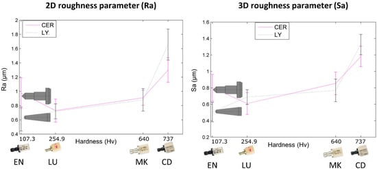 For both tools (LY and CER) and all feed rates, the 2D and 3D surface roughnesses of biomaterials CD and MK (hardest biomaterials milled) were rougher than the other biomaterials (Figure 5 and Figure 6). The roughness values of biomaterials LU and EN (milled soft and medium biomaterials) were the lowest. For each tool, the Ra and Sa roughnesses were observed to increase from the softest (LU) to the hardest (CD) biomaterial (Figure 7). The highest slope was observed between the medium (EN) and the hard (CD) biomaterials.