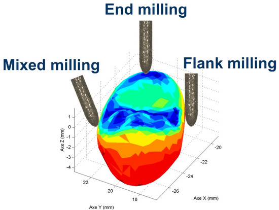 Tool milling mode applied on a dental crown, where the areas milled in end milling mode are in blue (occlusal shape) [30].