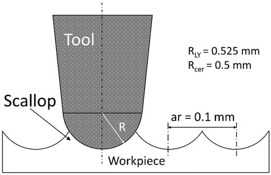 End milling with backwards and forwards sweeping (fifty in our case) using a ball-end tool tip and a constant radial depth (ar) should leave an anisotropic surface signature. This anisotropic signature should be generated by the scallop leaves on the surface by the combination of the tool tip geometry and two consecutive sweeps (Figure 9). Nevertheless, the milled surface observations (Figure 4) revealed isotropic surface topologies on all the samples. The isotropic topology was confirmed by additional roughness measurements parallel to the feed rate direction. These results suggest that ball-end tool geometry is not a key parameter that impacts roughness in end milling mode and highlights the importance of the tool diamond grits not taken into account by the geometrical model proposed and described in Figure 9. In end milling mode, very few diamond grits are in contact with the machined surface and the tool wear is caused by a null cutting speed near the tool axis, increasing the pullout/wear of the grits. This phenomenon can explain the low roughness values observed on the milled surfaces with the two tools. The abrasive grains lost from the tool during milling can be displaced and compressed between the surface to be machined and the tool, causing three-body abrasion. The resulting phenomenon, called lapping [32], is consistent with our results and leads to low roughness parameters and an isotropic surface topology.