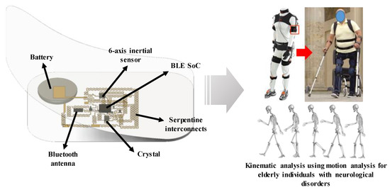 A schematic of the epidermal six-axis IMU is shown in Figure 1. The inertial sensor and the signal processing parts used to construct the proposed system include a six-axis inertial sensor (MPU6050; Invensense, San Jose, CA, USA), BLE SoCs (nRF52832; Nordic Semiconductor ASA, Trondheim, Norway), and several passive components. All electronic components are mounted onto the bonding pads, and all components are connected by the serpentine-structured interconnects, allowing the device to elongate under various mechanical strains. The top and bottom layers of the implemented device are covered with a stretchable adhesive film (Tegaderm; 3M, Saint Paul, MN, USA) in order to protect the electronic parts from moisture or dust during attachment to the human body. The device is designed based on a modular concept that allows internal components to be reconfigured, allowing for a miniaturized system that is functionally optimized for a variety of applications. Thus, it can be used as a multiparametric epidermal sensor system, whilst also maintaining the signal processing building block and adding a sensor that can measure electrophysiological signals, strain, or body temperature. As shown in Figure 1, the IMUs can be used for kinematic analysis of human motion by the attachment to various parts of the human body and can be applied to the diagnosis and rehabilitation of degenerative neurological disorders.
