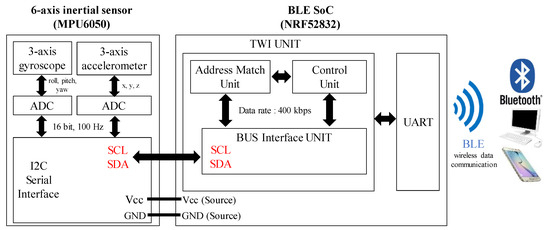 Figure 2 shows a block diagram of the wireless epidermal six-axis IMU. The six-axis inertial sensor and the BLE SoC read and send data using the two-wired serial interface (TWI), which uses two bus signals (serial clack (SCL) and serial data (SDA)) to exchange signals. From the six-axis inertial sensor, the acceleration and angular velocity of each of three axes are converted by the embedded 16-bit analog-to-digital converter (ADC). The digitized data are passed through the bus interface unit of BLE SoC via I2C communication. As there is a specific address for each piece of data, there is an address matching unit that processes the data according to the address. In the control unit, the data accumulated in the bus interface unit are processed and the commands are decoded. After the data are processed, they are spread by the universal asynchronous receiver/transmitter (UART) structure in the signal conditioning unit, and through Bluetooth communication the inertial data can be displayed on a mobile device. In the case of the MPU-6050, the accelerometer uses a full-scale range of ±16 g and a sensitivity scale factor of 16,384 LSB/g, where g is gravitational acceleration. For gyroscopes, we used a full-scale range of ±2000°/s sensitivity scale factor of 131 LSB/°/s. The nRF52832 and MPU-6050 use I2C communication with a communication frequency of 400 kHz. The sample rate of the gyroscope and accelerometer of the MPU-6050 is 100 Hz, and the register is read with I2C communication in the nRF52832 and transmitted via Bluetooth in hexadecimal form. Our previous work on this system showed a capability of transmitting wireless inertial signals using BLE SoC (nRF51822) and reported the possibility of real-time human joint angle estimation [20]. In this paper, we use the nRF52832 to extend the functionality of the system. The nRF52832 includes a balun inside the chip, reducing the size and wiring of the entire system and facilitating impedance matching with ease. In addition, the nRF52832 has twice the RAM of the nRF51822, which allows the configuration of a BLE mesh. When constructing a mesh, a large RAM size is required, and sensor data can be collected simultaneously from 17 IMUs which are equipped for the purpose of analyzing the movement of all joints in the human body, enabling the scalability of the human body to a 3D model. Moreover, with BLE 5.0, the transmission speed can be doubled, and the transmission distance can be increased by approximately 2.5 times.