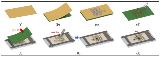 First, an 18-μm-thick piece of Cu foil (Copper 110 Annealed; Online Metals, Seattle, WA, USA) is laminated on the thermal release tape (TRT), as shown in Figure 3a,b. Then, as shown in Figure 3c, the TRT-laminated Cu foil is cut according to the interconnect and bonding pad pattern as designed by the CAD tool. After patterning by a programmable cutter, the residual area of the TRT-laminated Cu foil, except for the designed patterns, is removed manually using tweezers as depicted in Figure 3d. The opposite layer of the patterned TRT-laminated Cu foil is then bonded with the water-soluble tape (WST) and Kapton film, and the whole sample is bonded onto the glass substrate. As shown in Figure 3e, the bonded substrate is heated on a hot plate at 120 °C for 30 s, and the TRT layer is peeled off. After peeling off this layer, the bonding pad for circuit assembly is revealed. As shown in Figure 3f, the electronic components (six-axis inertial sensor, BLE SoC, chip antenna, passive components, and bridge interconnects) are aligned and fixed onto the bonding pads. Then, as shown in Figure 3g, the Kapton film is removed and the whole device is released from the glass substrate. The stretchable adhesive film is then used to cover the top layer of the circuit for encapsulation, as shown in Figure 3h. As shown in Figure 3i, water is dropped onto the WST layer using a pipette which dissolves the water-soluble compound of the WST. After this, the WST layer is peeled off to leave only the electronic components and the serpentine-structured Cu interconnects. Finally, after covering the bottom layer, the epidermal six-axis IMU on a stretchable adhesive film is ready for implementation.