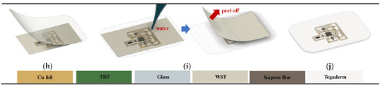 Manufacturing procedure. (a) Cu foil preparation; (b) Cu foil lamination on thermal release tape (TRT); (c) patterning using cutting tool; (d) residual Cu removal; (e) adhesion on water-soluble tape (WST), fixation on glass substrate using Kapton film, and TRT removal; (f) device soldered on Cu-patterned interconnects; (g) Kapton film removal and device release from glass substrate; (h) top-layer encapsulation; (i) WST removal; (j) bottom-layer encapsulation.