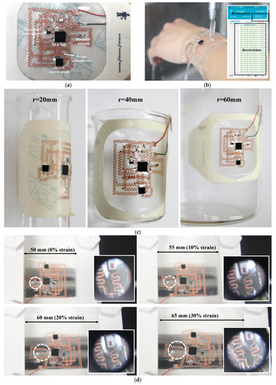 Recently, due to the rapid development of flexible/stretchable electronic devices, a number of soft wearable and portable devices have been reported [1,2,3,7]. By using thin and soft materials, the flexible bioelectronic modules can reliably interface with a part of the human body to monitor human motion with high fidelity. The skin-like wearable electronic modules have soft form-factors in order to achieve close contact with the human body, which prevents mechanical sliding and results in significantly improved performance. From the inherent skin-like characteristics of flexible and stretchable substrates, recent research has focused on the implementation of highly scalable and modularized epidermal electronic devices. Most commercially available wearable devices are implemented on a rigid substrate comprising silicon-based integrated circuit (IC) components. However, there is a large mechanical mismatch in the interface between the rigid devices and the human skin. To minimize data errors caused by movement of the human body, and to perform accurate measurements, it is essential that the wearable device is brought close to the skin. Additionally, in order to improve the fidelity between the system and the skin, the implementation of robust interconnecting parts is fundamental in the development of system-level-based epidermal electronic devices. Furthermore, the integration of wireless communication units enables continuous data logging with mobility, which can be used in ambulatory monitoring.