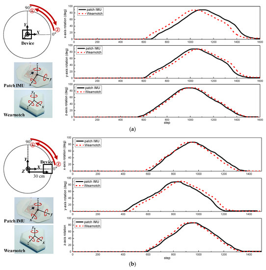 Performance evaluation of the wireless epidermal six-axis IMU. (a) Euler angle estimation at the center of the rotation plate; (b) Euler angle estimation at the end of the rotation plate.