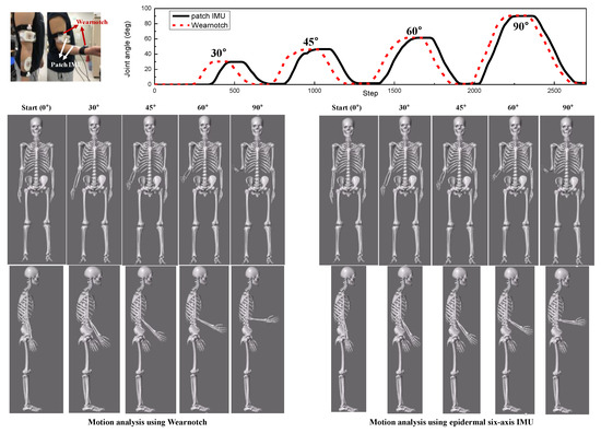 As shown in Figure 6, the implemented wireless epidermal six-axis IMU was attached in order to estimate the precise joint angle of the forearm. The experiments were carried out using Wearnotch and the epidermal six-axis IMU using the 3D motion analysis program, with each experiment being performed for five joint angles ranging from 0° to 90°. The estimated joint angles with respect to the rotation axis for each device were compared and showed similar results, which could also be determined in the 3D motion analysis program.