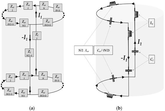 In a birdcage RF coil port can be established by interfacing the external circuit across any leg or end-ring segment but it exhibits the similar frequency characteristics. However, the port impedance as viewed from the external circuit would be different at both positions which results in different expressions for the general analytical solution. By considering the port connected across the end-ring segment Zer/2, the general analytical solution can be developed by calculating the equivalent impedance of the circuit model shown in Figure 6 as follows.