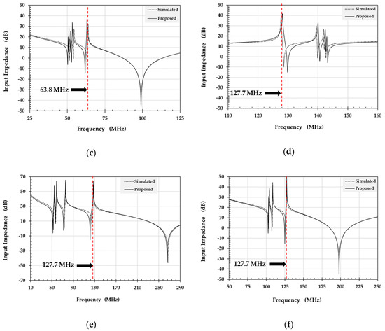 Input impedance obtained using proposed analytical solution and conventional 2D simulation for the different configurations of the birdcage RF coil: (a) 1.5T low pass, (b) 1.5 T high pass, (c) 1.5 T band pass, (d) 3 T low pass, (e) 3 T high pass, (f) 3 T band pass.