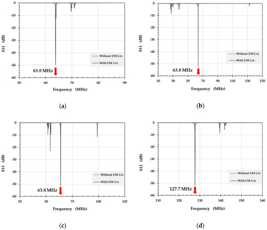 A comparison between the reflection coefficients obtained by using the proposed analytical solution in the absence as well as presence of the impedance matching circuit for all configurations of the implemented 1.5 T and 3 T birdcage RF coils is provided in Figure 9.