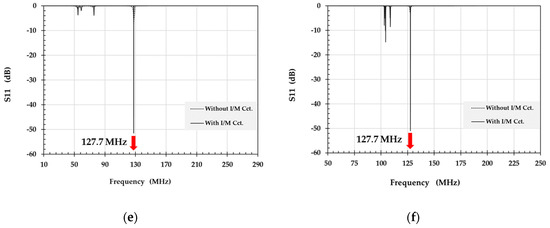Reflection coefficient S11 for the different configurations of the birdcage RF coil without and with impedance matching circuit: (a) 1.5 T low pass, (b) 1.5 T high pass, (c) 1.5 T band pass, (d) 3 T low pass, (e) 3 T high pass, (f) 3 T band pass.