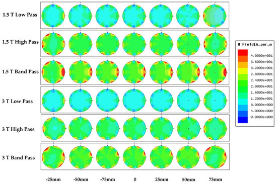 It can be observed in Figure 10 above that each coil configuration causes quite homogeneous magnetic field distribution at the dominant resonance frequency while the bandpass configuration produces rather strong magnetic field than others for both 1.5 T and 3 T cases.