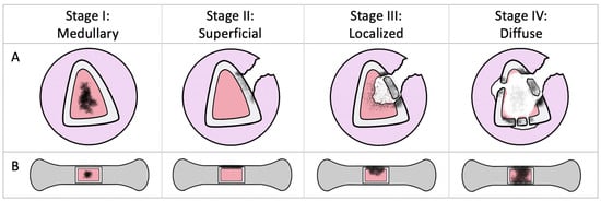 Simplified Cierny–Mader classification. Panel A: cross-sectional view of osteomyelitis in a long bone. Panel B: a longitudinal view with a window of bone removed. Stage 1 (medullary) osteomyelitis is confined to the medullary cavity. Stage 2 (superficial) involves the cortical bone and most often originates from direct inoculation or contiguous infection. Stage 3 (localised) involves both cortical and medullary bone. Stage 4 (diffuse) involves the entire thickness of the bone with a loss of stability. This figure was based on the original Cierny–Mader classification [11].