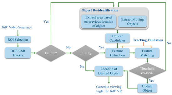 This was based on the idea of selecting an arbitrary object or ROI of a user in the first frame and tracking it in the rest of a 360° panoramic video. Based on that object’s location in each 2D panoramic frame, we calculated the viewing angle/gaze direction in terms of pitch and yaw to find the position of that object with respect to the 360° world space, which resulted in a narrative for watching the 360° video experience in VR. We developed a pipeline around the DCF-CSR tracker to make it robust for tracking objects in the sequence of 360° panoramic frames. As discussed in Section 1, while tracking the object of interest in panoramic videos, the most noticeable issues were movement of the object across the extreme edges of frames, loss of an object due to occlusions, shape deformation, and unexpected movement that occurred in stitched areas of panoramic frames. In our proposed framework for object tracking, we developed two main modules on top of the DCF-CSR tracker to make it robust for object tracking in 360° panoramic frame sequences, as shown in Figure 3. The first module focused on tracking and validation to ensure the success of the DCF-CSR tracker, while the second module mainly targeted object re-identification in case of the loss of the object. Another purpose of it was to handle the problem of occlusion where another object covered a desired object. Finally, the output of the tracking algorithm in terms of an object’s location in the frame was treated as input to the final module of the viewing angle generator for 360° virtual reality. It generated the final narrative for 360° videos, which held the viewing angle in terms of pitch and yaw with respect to time over the complete course of an entire 360° video.