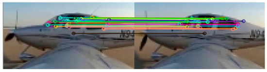 The tracking validation module consisted of two main components: Feature extraction and feature matching. Both components worked mutually. We used the oriented fast and rotated BRIEF (ORB) feature descriptor, which is a fusion of the FAST key point detector [23] and BRIEF descriptor [24]. ORB was faster than the SIFT and SURF descriptors, as well as being better in matching performance [25]. We used ORB feature descriptors due to its fast performance and it incurred less computational cost to our proposed algorithm in feature matching. Moreover, for feature matching, we used the fast library for approximate nearest neighbors (FLANN)-based descriptor matcher [26]. It finds the nearest neighbors based on feature descriptors provided from two images. After performing feature matching, we kept only good matches based on the matching distance of the features between two images, as shown in Figure 4. The threshold for matching distance was 0.8 out of a maximum value of 1. We kept this value high to make the validation accurate and sensitive to avoid wrong object selection.