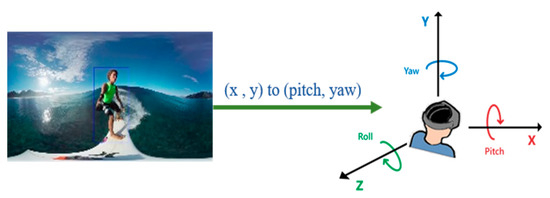 The main purpose of this system was to generate experiences of 360° videos for VR. Therefore, the final module of the object tracking pipeline was to generate the viewing angle for a tracked object’s location for 360° VR. The viewing angle depends on head rotation in VR. This rotation measure consists of roll, pitch, and yaw, as shown in Figure 6. The viewing angle decides the target area to focus on by the viewer in VR. Thus, after tracking the location of a desired object in the 360° video frame, we calculated the required viewing angle to focus on and watch this object in VR. For viewing angle, we calculated pitch and yaw from x and y coordinates in the panoramic frame. The x and y coordinates used were the central pixel coordinates of the object’s location in the panoramic frame. We calculated the viewing angle for the target object over the course of a whole 360° video and stored it in an external file with time information. At the end of the video, those stored values of viewing angle within 360° resulted in a narrative for watching the panoramic video in VR. The generated narrative guided and provided an experience of the 360° video to the viewer in VR.