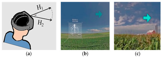 (a) We decreased the opacity of the visual indicator as the viewer’s angular distance decreased between the center of the current FOV and intended target. It gave awareness to the viewer about how close he/she was to the intended target. We considered an intended target as one clearly visible by the viewer based on the angular distance (15° for pitch and 20° for yaw) between current head rotation and intended head rotation. We represent the current head pose as ‘H1’, the head pose required to focus on an intended target as ‘H2’, and the angular distance between them as ‘θ’ (Figure 7a). If the opacity of the visual indicator is denoted by ‘O’, the direct relation between ‘O’ and ‘θ’ can be represented as in Equation (2).
