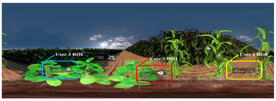 The main purpose of the system was to generate multiple experiences from a single 360° video. Users could be interested in different information within a single panoramic frame during a video. The variety of users’ interests could lead to the generation of multiple experiences from one visual content source. These various experiences could be saved by using the ‘Creator Part’ presented in Section 4.1. Figure 8 shows the different ROIs in a frame, focused by different users while watching a 360° video in VR.