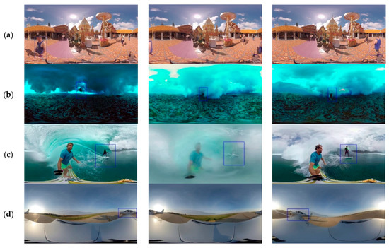 Visual results of proposed object tracking method on 360° videos showing correctly detected desired object and successful object tracking. Three frames from each video, (a–d) represent different challenges faced during tracking