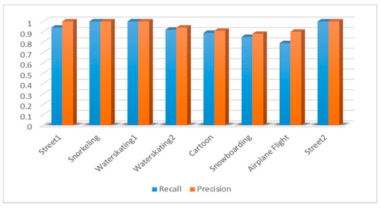 If we analyze the information provided in Table 1, the precision measure was higher than the recall measure. The reason for the high precision measure was the strong validation module presented in Section 4.1.2.2. We made the validation module very sensitive, due to which it rejected candidates with less feature matching. Consequently, in the case of object re-identification, it had been rejecting the candidates as soon as it got a candidate object with high matching. This resulted in a slight decrease in the recall measure, as seen in the videos “Snowboarding” and “Airplane Flight.” Another reason for the least recall value for the three videos is the division of an object into two parts for a long time while it went out of the margin of the 360° frame and appeared on the other side. If we reduce the sensitivity of the validation module towards matching, there is a possibility of an increase in the recall measure. Figure 10 presents a clear picture about recall and precision for object tracking results in all 360° panoramic videos.