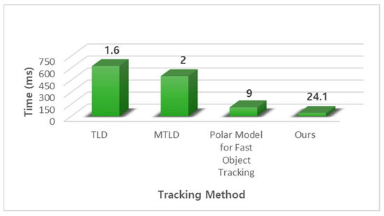 As we developed a system for real-time use, one of our focuses was to keep the processing speed high. The proposed method for object tracking in 360° panoramic videos was implemented on an Intel Core i7-7700k CPU @ 4.20 GHz. We implemented the code of this algorithm in Python along with OpenCV functions. This code was nonoptimized, and by running on a standard machine, it achieved approximately real-time performance with an average speed of 24.1 fps. Resolution of the immersive videos was very high, which resulted in slow computation speed. To further enhance the computation speed, we down-sampled the frame size and tracked the object at this resolution. Instead of down-sampling to a fixed size of frame, a down-sampling rate (25%) was used, which overcame the loss of the content’s important information. After tracking the object’s location in a down-sampled 360° frame, we remapped the location of the object in the 360° frame with the original resolution. In this way, it boosted the overall speed of the algorithm with no effect on tracking performance. Figure 11 shows a comparison of our method’s speed performance with the performances presented by Ahmad et al. [18]. These methods also presented simple online arbitrary object trackers by using the conventional approaches in their techniques for fast object tracking in 360° videos. Figure 11 shows information on computation time per frame for each method along with information on speed in fps.