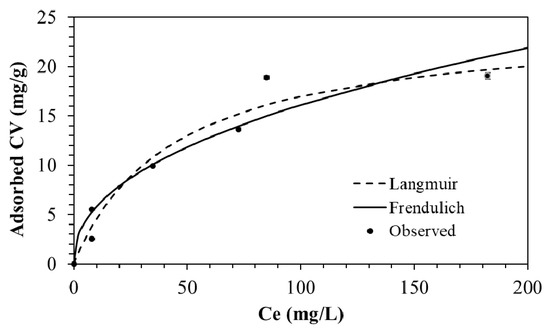 where qt is the amount of adsorbed CV (mg/g) per unit mass of BC-PKS at time t, qe is the amount of adsorbed CV (mg/g) per unit mass of BC-PKS when equilibrium is reached, k1 is a pseudo-first-order rate constant (1/h), and k2 is a pseudo-second-order rate constant (g/mg/h). The results of isothermal adsorption experiments were analyzed using the Langmuir (Equation (3)) and Freundlich (Equation (4)) models [55,56,57]
